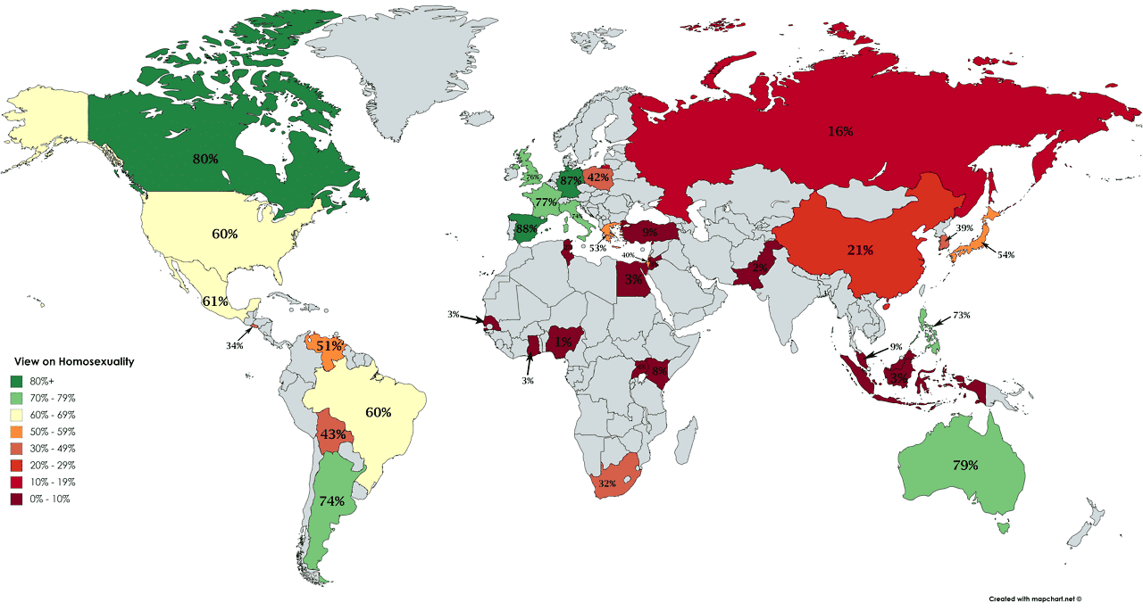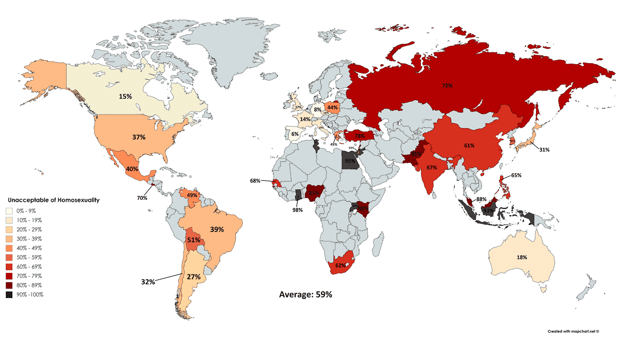 Por supuesto hay lugares donde los números serán mucho mayores que en Estados Unidos. Donde lo anti-LGBT+ es norma. Lugares donde mantener una relación homosexual es ilegal y, en algunos casos, penalizado con la muerte.