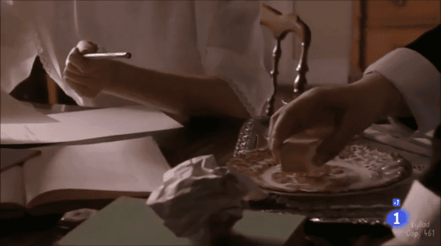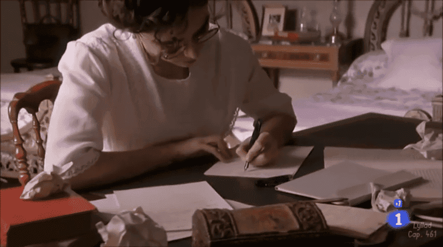 A Celia le llega la inspiración, como no, y se pone a redactar el folletín y se lo va