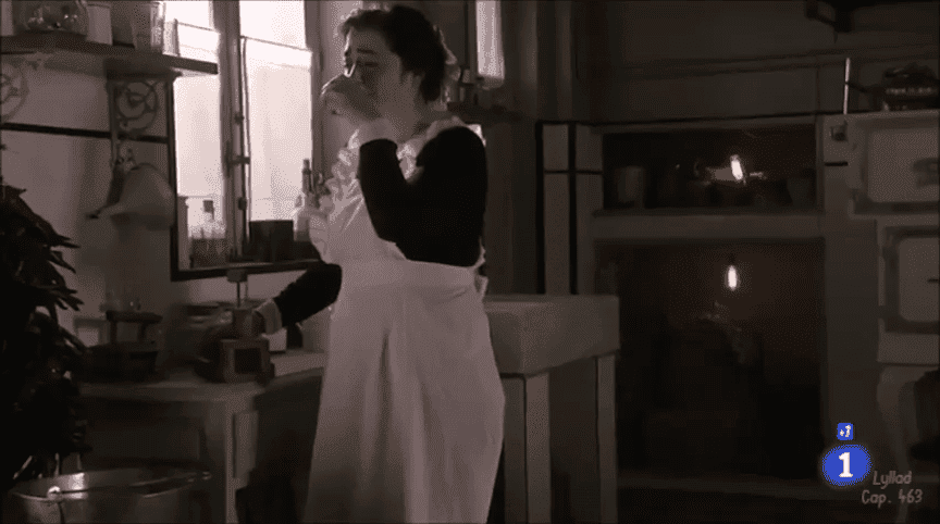Más adelante, Elpidia se está dando a la bebida (y llorando) en la cocina de la Casa