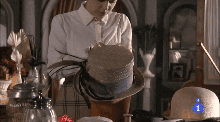 Cata está acabando de retocar un sombrero cuando entra Cándida. Después de