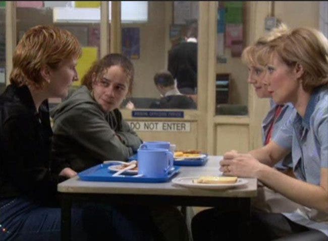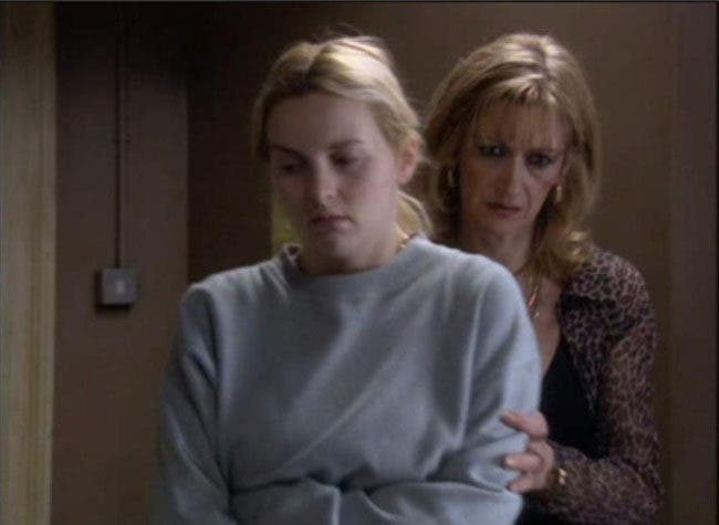 Shell está tan nerviosa por la visita de su madre que incluso vomita en la espera. Cuando entra Karen a buscarla en su celda, se pone borrica y dice que no quiere acudir a la cita materna. Parece que le tiene a su progenitora un verdadero pavor. Karen procura insuflarle ánimos: Shell debe enfrentarse con sus demonios y dejarle muy claro a su mamá que está pendiente de sus hijas y que le pedirá cuentas si no se porta bien con ellas. Tiene que responsabilizarse por fin de las niñas y aclarar que las protegerá pase lo que pase. Tras varias vacilaciones, Dockley decide echarle ovarios al asunto y presentarse en la entrevista. Vemos por fin a su mamá: tiene la señora unas pintas curiosas (mezcla de zorra de carretera y macarra de burdel; aparte de –y que me perdone la actriz- ser más fea que Picio, ¡qué narizotas, por favor, ni un oso hormiguero!). Shell (a quien la “dama” llama por su nombre completo y no por el diminutivo: Michelle) lleva la cara limpia de pinturrajos y va vestida en plan sencillito.