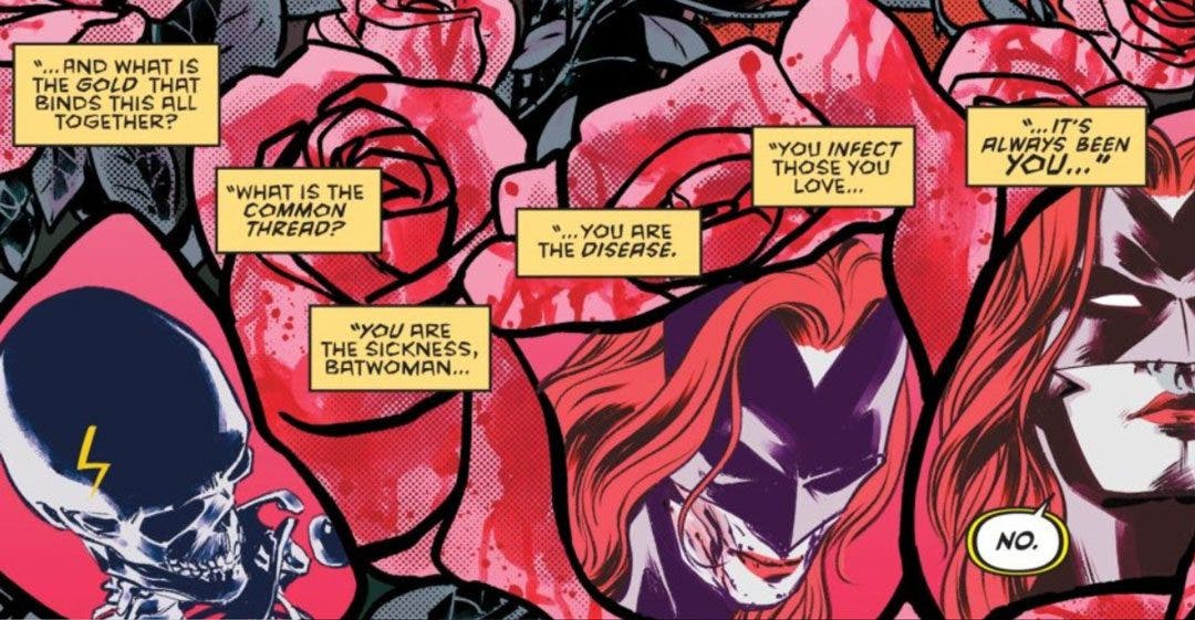 Colony Prime aprovecha el momento para recordarle a Kate lo guay que es su padre y lo mala malota que es ella por no saber apreciarlo, pero Batwoman está muy cansada del discurso de hermano mayor y le responde que su padre ha hecho muchos sacrificios pero también ha sacrificado a mucha gente buena en el proceso y para ella ahí está el límite. Así que sus buenas intenciones no le impiden ver que el camino oscuro que ha tomado para llegar al resultado final.