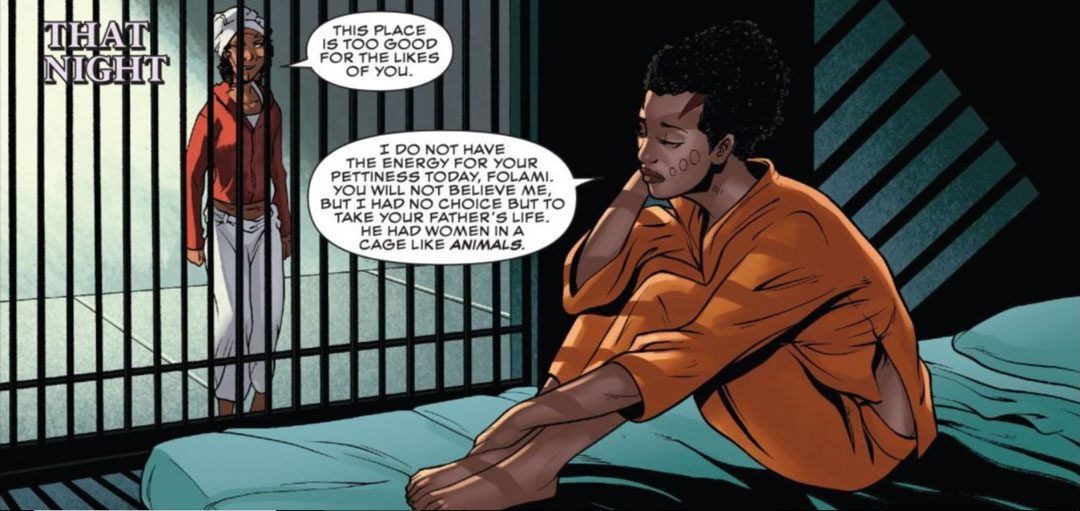 Mientras tanto Zola manda llamar a Folami que está indignada y toda la situación se complica cuando descubrimos que el hombre que han acusado es su padre. La joven Dora Milaje no cree para nada las acusaciones contra su padre y así se lo expresa a Zola que le dice que entiende su sentimiento pero aún así deben investigar. Folami está que trina porque piensa que si fuera cualquier otra Dora Milaje Zola confiaría en su sentido común, y es verdad, pero Zola sabe que Folami no es de fiar por sus acciones.