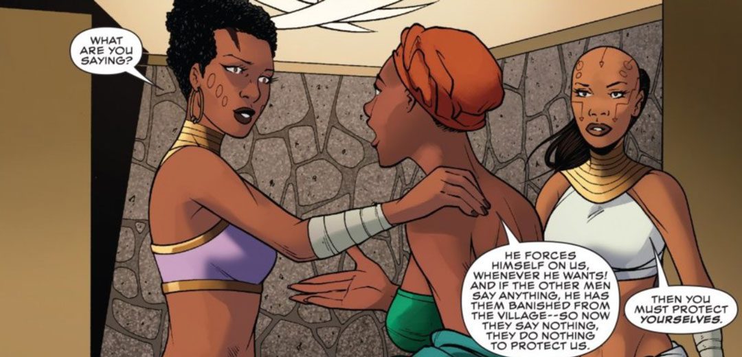 Mientras tanto, una mujer llega rogando ayuda las Dora Milaje. La chica les cuenta que el jefe de la tribu de Kagara se está aprovechando de su poder. Abusa de las mujeres y los hombres a su alrededor no hacen nada porque tienen miedo. Así que les ruega su protección. Ayo y Aneka le juran que harán todo lo posible y le piden que descanse mientras se preparan.