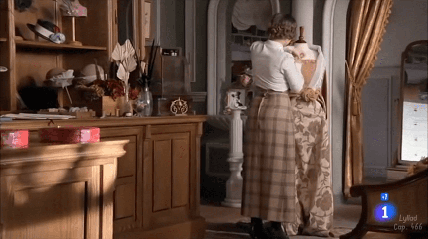 Cata está retocando un vestido cuando entra Celia. La costurera la saluda con un