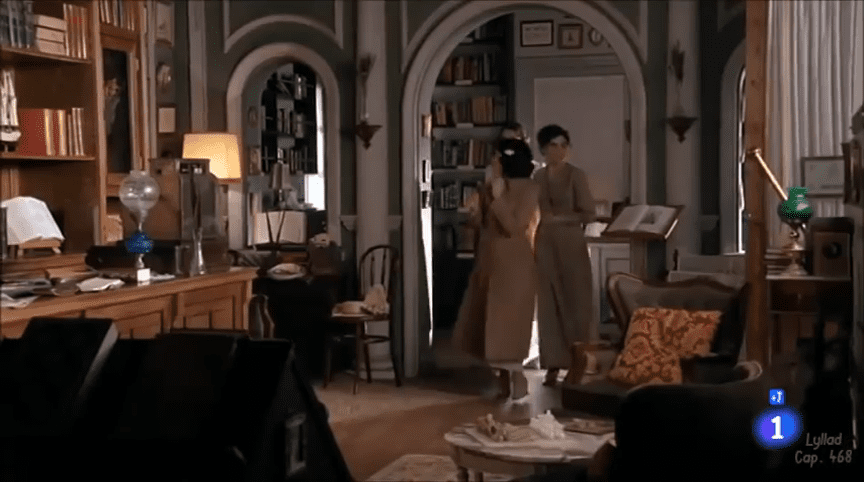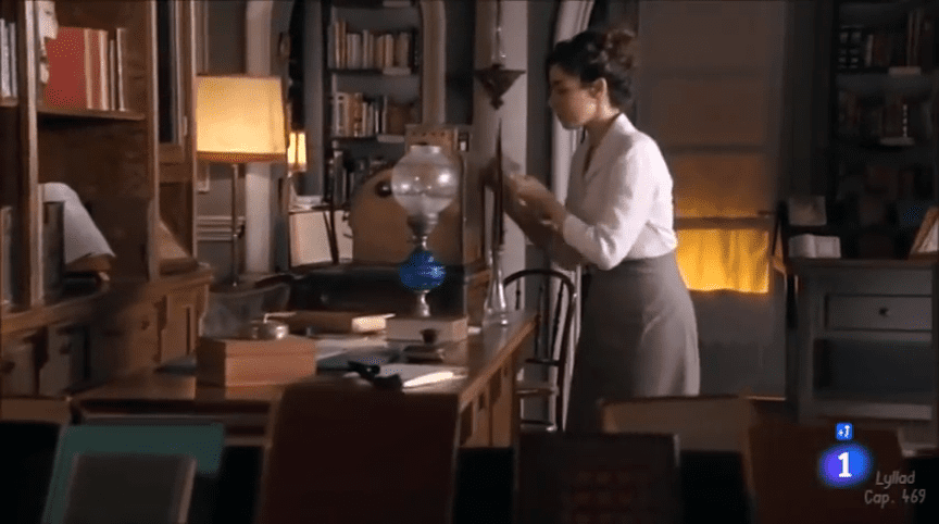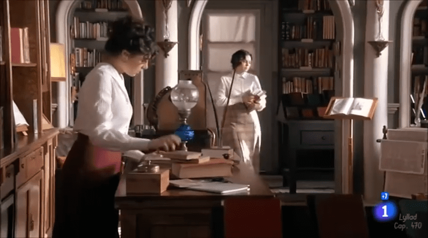 Celia está colocando unos libros cuando entra Cata sin que se entere. Se queda