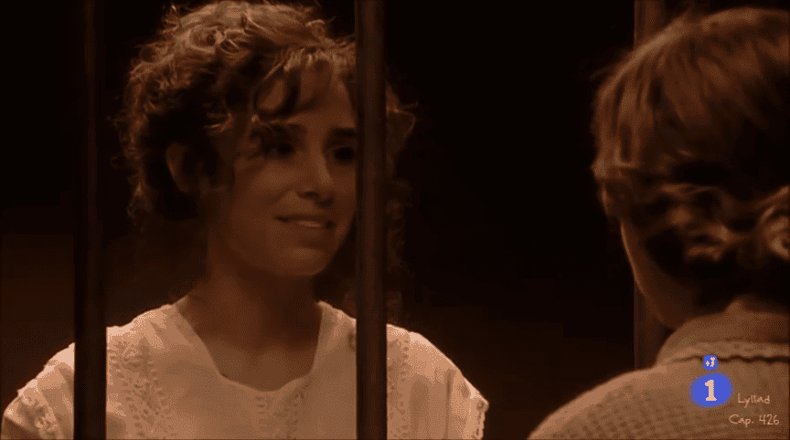 Maestra y alumno están merendando en el Continental. Benito le quiere decir algo importante a Celia, es decir, que está hasta las trancas por ella, y como las palabras no le salen, decide pasar a la acción e intenta plantarle un morreo a Celia, ésta, que tiene unos reflejos que más de un@ quisiéramos, lo para a tiempo. ¿Qué esperabas, chaval? ¿Llegar y besar el santo? (nunca mejor dicho) Pues NO. ¡Esos labios sólo tienen una dueña y se llama AURORA ALARCÓN! Frente a la negativa de la maestra, el chaval le echa en cara que sólo piensa en la causa sufragista y coge y se pira todo indignado (A ver, elemento, pues claro que Celia piensa en eso, ¿no ves que es ahí donde están las mujeres? ¡Que CELIA es BOLLITO! ¡Es donde puede ligar!)