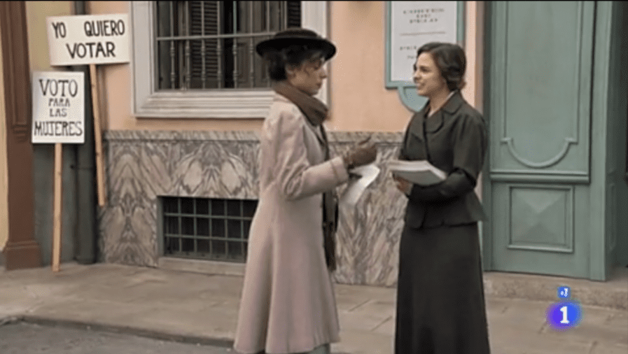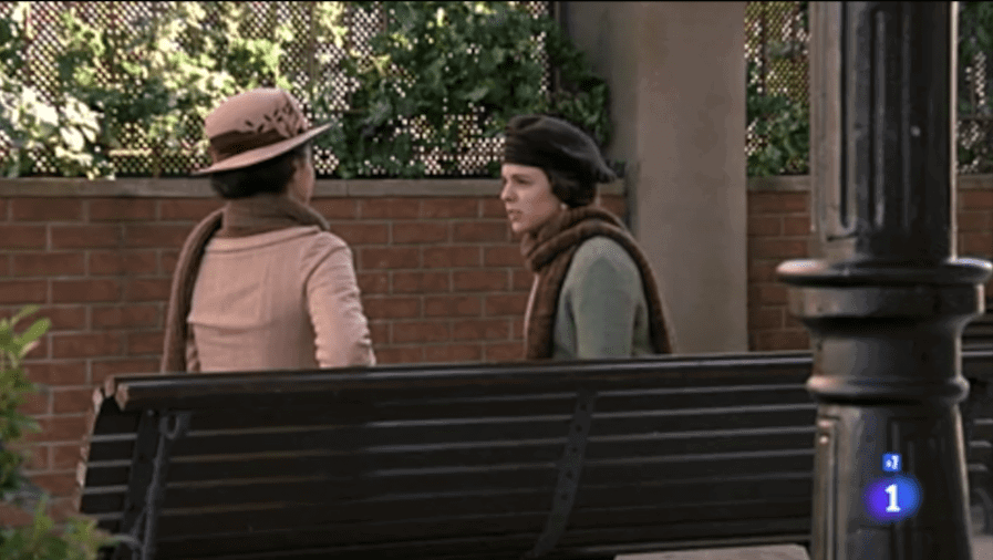 Celia y Cata ultrajando el banquito de #Aurelia (bueno no, en realidad no es ese banco), a lo que iba, las chicas están en un banco hablando sobre lo ocurrido días atrás. Cata no se siente a gusto y decide dejarlo hasta que el grupo de mujeres cambie su forma de actuar. La costurera quiere que sigan hablando, que lo aprovechen a su favor ahora que los periódicos tratan el tema, pero Celia no está para nada convencida. Ésta, además, le dice a su amiga que "gracias" a lo que ha pasado, ha recibido una llamada del diputado Santiago Eslava (ese hombre que las citó para hablar de sufragismo y poder llevar su causa a las Cortes pero que al final no cuajó) Celia es optimista, cree que en esta ocasión SÍ van a ser escuchadas; le pide su apoyo a Cata pero esta se niega en rotundo (lo mejor que haces, chica)