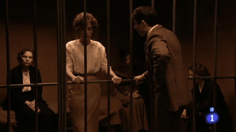 Ahora bien, los espectadores estamos tan "contentos" viendo las demás tramas cuando Diana recibe una llamada en la casa familiar y le comunican que su queridísima hermana ¡¡¡Celia ESTÁ EN LA CÁRCEL!!! ¿WHAT? ¿Cómo hemos llegado a esto? Pero sí, así es, Celia y el resto de sufragistas se encuentran encarceladas, según Celia, la policía no tiene pruebas contra ellas, pero seguro que se las inventan. En la escena está hablando con Velasco, que intenta meterla en vereda, pero no hay forma, la maestra tiene sus convicciones muy sólidas y nadie va a conseguir que cambie de opinión.