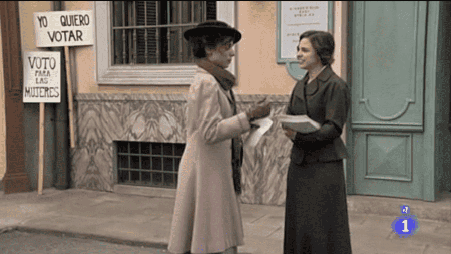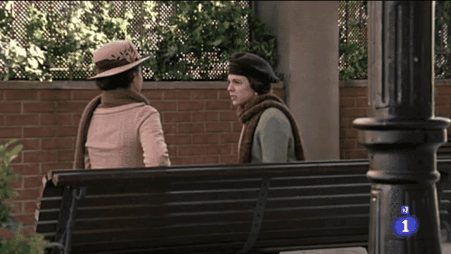 Celia y Cata ultrajando el banquito de #Aurelia (bueno no, en realidad no es ese banco), a lo que iba, las chicas están en un banco hablando sobre lo ocurrido días atrás. Cata no se siente a gusto y decide dejarlo hasta que el grupo de mujeres cambie su forma de actuar. La costurera quiere que sigan hablando, que lo aprovechen a su favor ahora que los periódicos tratan el tema, pero Celia no está para nada convencida. Ésta, además, le dice a su amiga que “gracias” a lo que ha pasado, ha recibido una llamada del diputado Santiago Eslava (ese hombre que las citó para hablar de sufragismo y poder llevar su causa a las Cortes pero que al final no cuajó) Celia es optimista, cree que en esta ocasión SÍ van a ser escuchadas; le pide su apoyo a Cata pero esta se niega en rotundo (lo mejor que haces, chica)