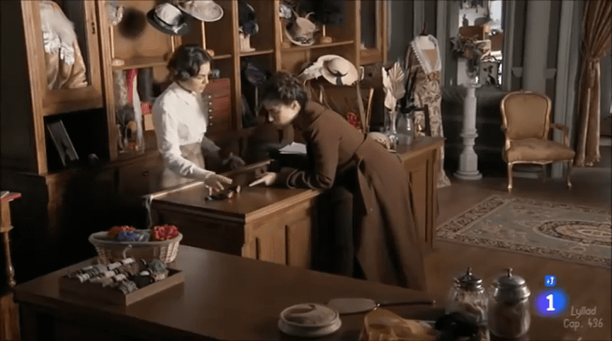Por la tarde, Celia y cata están en la Villa de París. La maestra se está probando una camisa y tiene dificultades para abrocharse un botón, la costurera se ofrece encantada. Le acaba de colocar el cuello y ¡ZAS! ¿LE PLANTA UN BESO! Celia se queda a cuadros (claro, no se lo esperaba para nada) pero enseguida reacciona y le pregunta que qué leches ha hecho. Cata le pide perdón en un primer momento, pero luego se arma de valor y le casca que ¡LLEVA TIEMPO QUE SE SIENTE ATRAÍDA POR ELLA! Celia aluciflipa, pero ahí no queda la cosa: