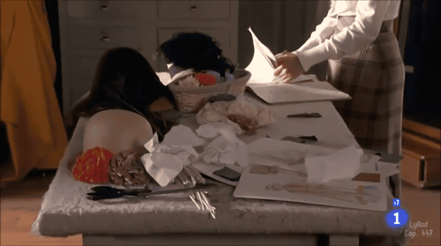 Cata está preocupada porque lleva días abriendo la tienda tarde. Es normal, muchas de esas veces era porque por la noche estaba entretenida con Celia en la cama, más que comprensible (jijiji) pero me da la sensación, que esta última noche no ha podido pegar ojo por la amenaza de Benito, ya que “hoy” es cuando han quedado en la habitación de ella para cumplir los “deseos” del bebé. A todo esto, Cata no se lo quiere contar a Celia, pero ésta no es tonta y sabe que algo le pasa a su compañera.