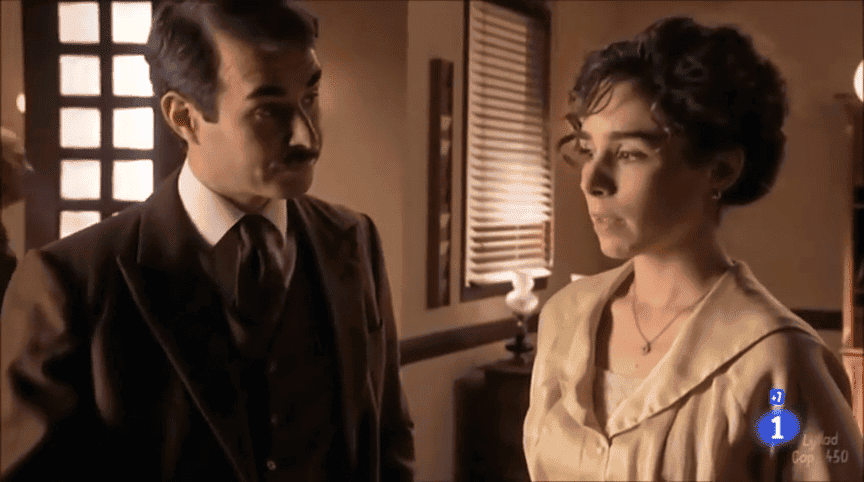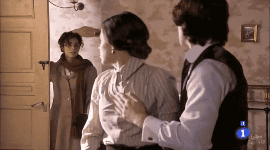 Cata llega a su habitación y, ¿a que no sabéis quién la está esperandooooo? Pues sí, EL CERDO. Le pregunta qué tal le ha ido el día, que se lo tiene que contar como NOVIO suyo que es… (¿¿Me he perdido algo?? Porque que YO sepa, este “algo” es un VIOLADOR Y MALTRATADOR, NO su NOVIO) (Me hierve la sangre). La costurera le deja clarinete que NO son ni NOVIOS ni AMIGOS, que está ahí porque la obliga. Ahora resulta que el guarro este quiere que “sus citas” sean más románticas, ¡que es un sentimental, dice! El chaval empieza a besar a Cata cuando… CELIA ABRE LA PUERTA Y ¡ZAS!