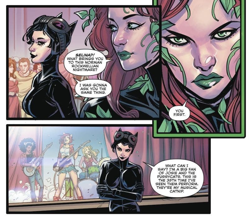 Obviamente vemos a los personajes de Archie, porque Ivy y Harley están de visita en su mundo. Pero para deleite de todas, también veremos a varios personajes icónicos de DC en las páginas. Por ejemplo, en la fiesta veremos a alguien vestido de Catwoman, que va a resultar ser la propia Selina Kyle, quien confiesa ser fan de Jossie and the Pussycats.