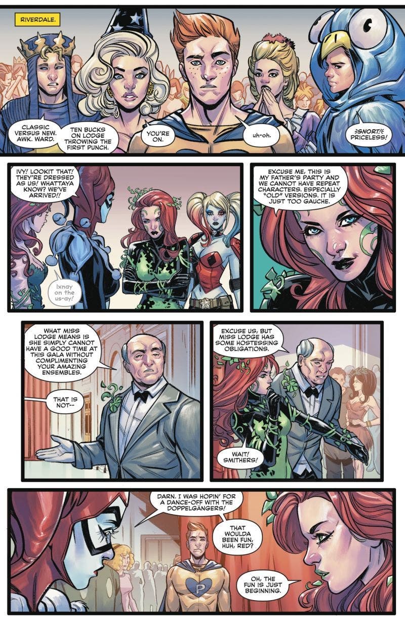 Obviamente vemos a los personajes de Archie, porque Ivy y Harley están de visita en su mundo. Pero para deleite de todas, también veremos a varios personajes icónicos de DC en las páginas. Por ejemplo, en la fiesta veremos a alguien vestido de Catwoman, que va a resultar ser la propia Selina Kyle, quien confiesa ser fan de Jossie and the Pussycats.