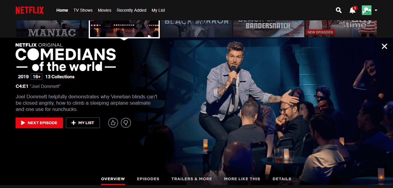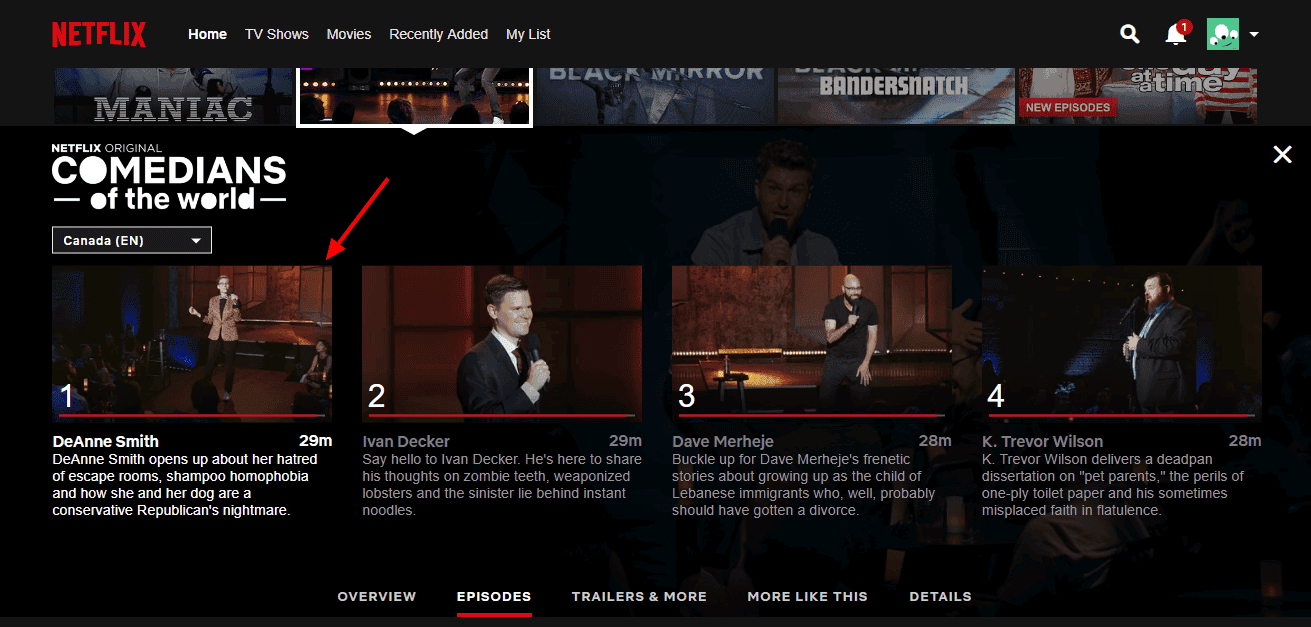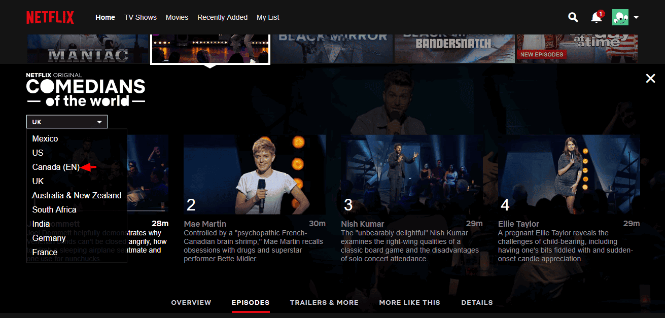 Es decir la “serie” se llama Comedians of the World, y en lugar de temporadas consiguen son regiones, como México, Reino Unido, Francia, India, etc. Ahí deben seleccionar la opción Canada (EN), o Canadá en inglés, porque también hay otra edición canadiense, pero en francés.
