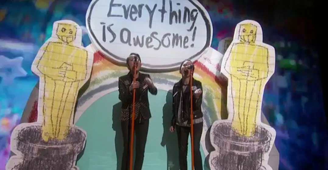 Luego vimos a las hermanas en el escenario cantando "Everything is Awesome", una de las canciones nominadas a mejor canción que pertenece a la banda sonora de la Lego película. Fue uno de los momentos más divertidos y animados de la gala, con las chicas cantando con un arcoiris inmenso de fondo y un pequeño ejército de músicos, vaqueros y constructores (muy al estilo lego) cantando y repartiendo Oscars hechos de Legos. Que no valdrán lo mismo pero molaban igual.