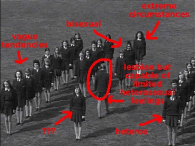 Sin embargo de esas 20, 15 simplemente mostraran tendencias homosexuales vagas, sin siquiera llegar a tener jamás parte en un acto lésbico.