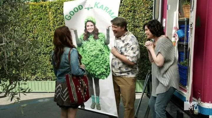 Más tarde a Karma casi le da un sincope cuando ve una furgoneta de color rosa en la que pone “Good Karma” aparecer por el patio del instituto. Y si, son sus fantásticos padres, que montan su chiringuito en el nuevo reino de su hija y así también es una manera de apoyar a su guapa hija lesbiana. Son tan frikis como adorables, no me lo neguéis. La verdad es que los padres necesitan dinero, así que la chica se ablanda y solo les pone una condición, que no pongan este poster…