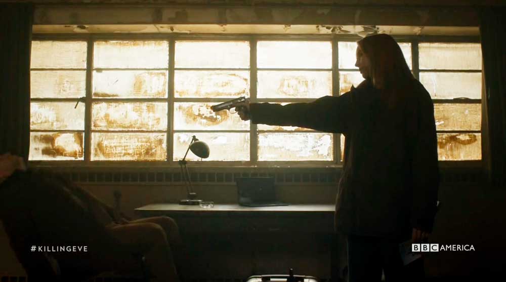 El caso es que mientras se toma las pastillas le dice a Villanelle que está orgulloso de ella, que es lo mejor que le pasó en la vida, que la quiere más que a su propia hija. Y a ella se le inundan los ojos de lágrimas, pero aún así le dice que se siga tomando las pastillas porque tiene claro que el trabajo es primero. Entonces él le lanza el vaso a la cara y aprovecha la distracción para darle con un tronco de la chimenea con toda su fuerza y salir corriendo.