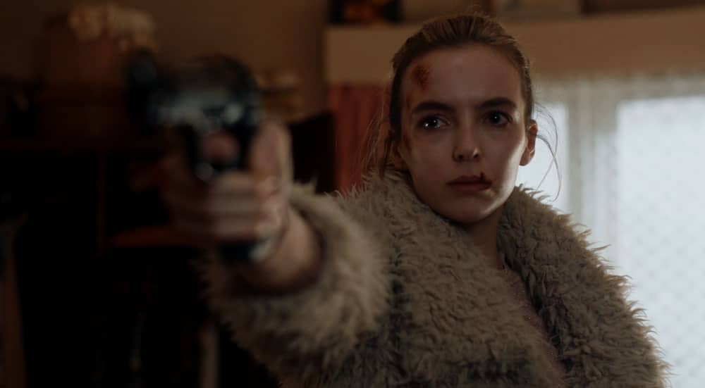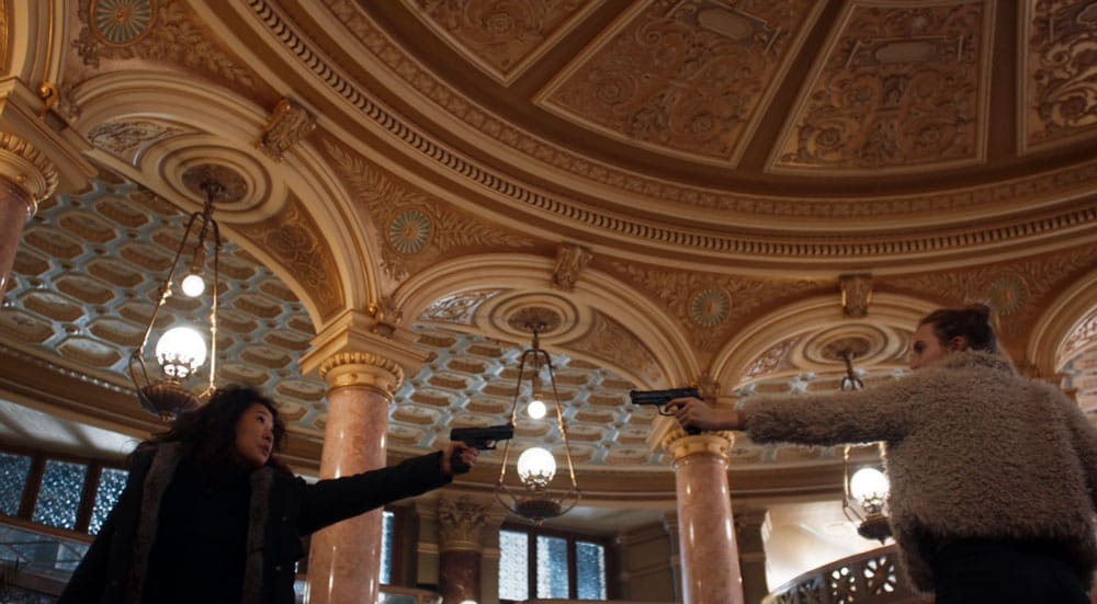 Eve sale pitando para encontrar algo con qué pararle la hemorragia y Villanelle aprovecha el momento para pillar la pistola y disparar a su rumbo. Pero no le da y es algo en lo que he pensado mucho, porque por un lado la rubia se está desangrando, eso puede afectar su puntería. Pero por otro creo que, una persona de su experiencia en estas lides se ha visto en problemas de este estilo en otra parte y un asesino herido es más peligroso todavía.