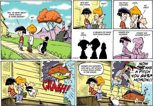 El cómic que pueden ver o no por que tuve que hacer más chica la imagen para que cupiera en este post ha levantado una controversia muy grande entre los conservadores. Les hago una pequeña traducción libre: Cuadro 1*Hey ¿Oyeron lo de David Dinke? El de tercero*No...