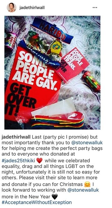 La última foto de la fiesta (lo prometo), pero lo más importante, gracias a @stonewalluk por ayudarme a crear las bolsas de la fiesta perfectas y a todos los que donaron en #Jades25thkiki mientras celebramos la igualdad, drag y todas las cosas LGBT en la noche, desafortunadamente todavía no es tan fácil para otros. Visiten su sitio para obtener más información y donar si pueden en Navidad. Espero con interés trabajar más con @stonewalluk más en el Año Nuevo.