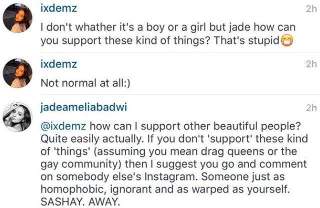 Jade: ¿Cómo puedo apoyar a otra gente maravillosa? Muy fácilmente en realidad. Si no «apoyas» este tipo de «cosas» (asumiendo que te refieres a drag queens o a la comunidad gay), entonces te sugiero que vayas y comentes en el Instagram de otra persona. Alguien tan homofóbico, ignorante y retorcido como tú. ADIOS