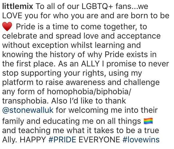 A todos nuestros fans LGBTQ+… os QUEREMOS por quienes sois y nacisteis para ser. El Orgullo es un momento para reunirse, para celebrar y difundir el amor y la aceptación sin excepción, mientras se aprende y se conoce la historia de por qué el Orgullo existe en primer lugar. Como ALLY, prometo no dejar de apoyar vuestros derechos, utilizando mi plataforma para crear conciencia y desafiar cualquier forma de homofobia / bifobia / transfobia. También me gustaría agradecer a @stonewalluk por invitarme a su familia y educarme sobre todas las cosas LGBT y enseñarme lo que se necesita para ser un verdadero ALLY. FELIZ ORGULLO A TODOS