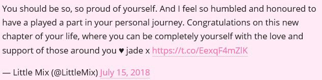Durante el pasado Orgullo, las chicas subieron fotos con la sombra de ojos pintada con la bandera gay y con mensajes de Feliz Orgullo. También Jade compartió este mensaje en su Instagram y en la cuenta común de Little Mix: