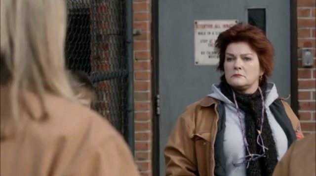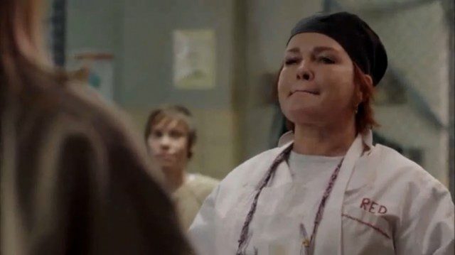 Pero no es la única a la que han fastidiado la mañana, Nicky a la que vemos muy atareada haciéndole un trabajito a Morello descubre que la chica va a prescindir de sus servicios, porque no lo ve justo para su “prometido”, ese del que no para de hablar pero que nadie ha visto jamás. Aparte conocemos por fin a uno de los mejores personajes de la serie, la gran Pennsatucky alias la chiflada cristiana ex-heroinómana, que así de entrada vemos cargando con una cruz gigante, algo que entra dentro de la normalidad de la serie.