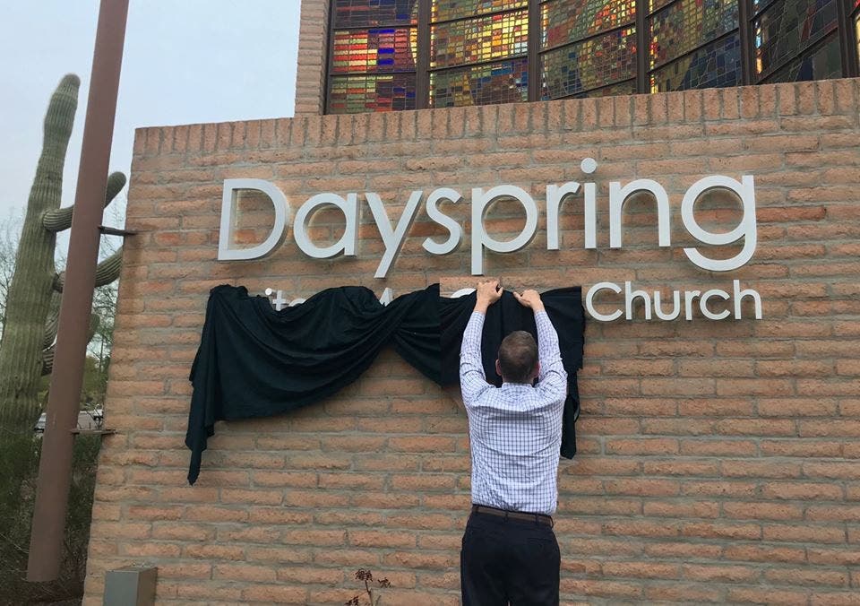 La iglesia Dayspring tapa con tela negra, en señal de duelo, las palabras «metodista unida»