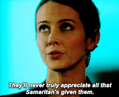Pero volviendo al tema, Root esta viva en esta realidad, pero jamás conoció a La Máquina, así que en su búsqueda eterna de algo que vaya más allá, se topó con Samaritan y decidió seguirle. Así que se convirtió en una especie de Martine (más guapa) que sigue pensando que los humanos somos código malo. También es fría como un témpano de hielo porque jamás conoció el amor ni a Shaw.