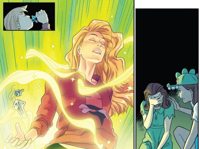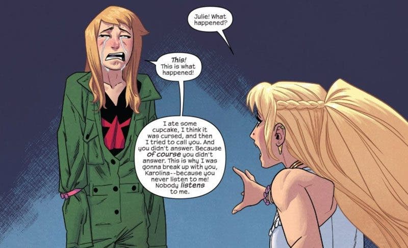 La última vez que hablamos de Runaways nuestra amada Karolina Dean andaba metiendo la pata muy duramente en su relación. De hecho había dejado de plancha a Julie cuando habían quedado de hablar sobre el futuro de su relación. ¡Mal asunto! Sobre todo porque Julie se come sin querer el muffin encantado de Molly y ¡termina convirtiéndose en una niña!
