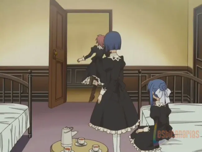Y las interrumpe (como les pasa siempre, pobrecitas, no las dejarán darse el beso a gusto ehh) una chica de primer curso a la que se le han caído unos cuántos libros en la cabeza, haciendo un gran escándalo. Nagisa-chan corre a preguntarla si está bien, y en ese momento llega Tamao-chan, diciendo que Rokojou-san (la presidenta del consejo) le había dicho que la encontraría en la biblioteca y que fuera rápido (vamos que quería impedir otra escenita de Shizuma-sama y Nagisa-chan)
