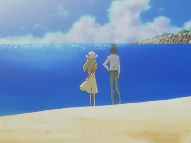 Hikari-chan llega corriendo a la estación para justo ver como el tren se aleja, sin ella. Pero cuando se gira, ve a Amane-sempai, que no se ha subido al tren si no que se ha quedado esperándola, sentada en un banco. El siguiente tren que pasa va en dirección contraria a la ciudad (que es, inicialmente, hacia donde nuestras chicas tenían intención de ir), y se montan en él. Después de un lindo paseo por el bosque, llegan… ¡a la playa! Que bonito…