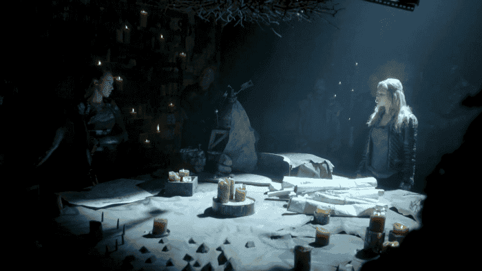 En la siguiente escena ya sabemos que Clarke está dándose una vuelta por el bosque y justo aparece ese mismo grounder y empieza a lanzarle flechas aprovechando que está sola. Cuando se entere Lexa, vas pa’ la hoguera, te lo digo ya. Consigue arrinconarla, pero Lexa se ve que juega mucho a los dardos, llega rápidamente y le lanza un cuchillo a distancia que le atraviesa toda la mano.