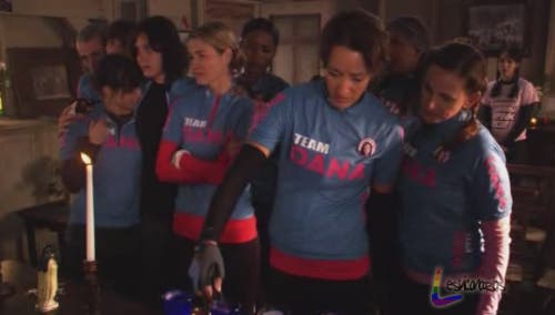 Nuestro episodio comienza con todas nuestras chicas escuchando un emotivo discurso de inicio de lo que será el paseo en bicicleta para recolectar fondos para la investigación del cáncer de pecho. Las chicas L llevan un bonito uniforme azul que dice Team Dana en el pecho y las mangas, y es increíble que pasen las temporadas y yo siga extrañando igual a Dana. ¡Te queremos Dana!