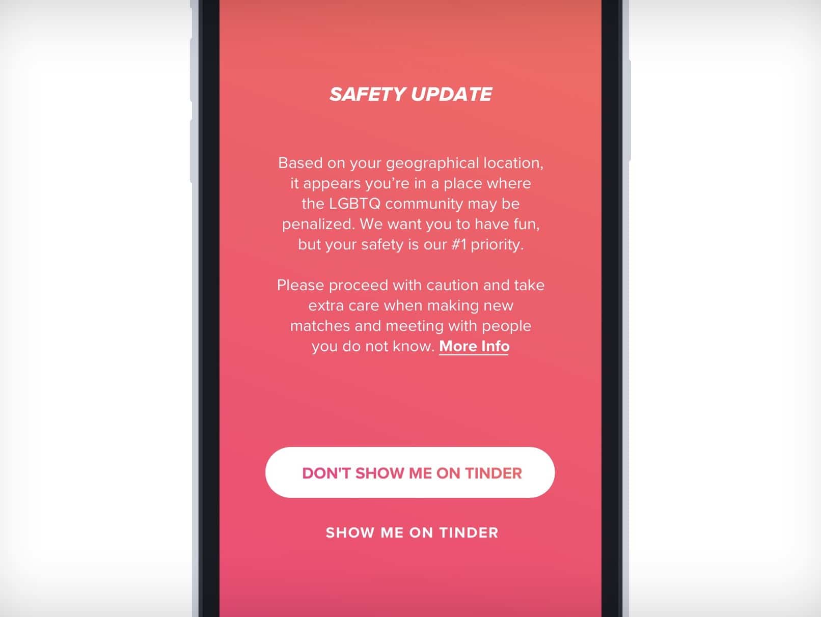 A partir de ese momento los usuarios tendrán la opción de mantener su ubicación en privado. Si el usuario decide mantener su ubicación pública Tinder ocultará su orientación sexual, o identidad de género, de su perfil, para asegurar que la información no caiga en manos de quienes la puedan usar en contra de estos usuarios. Una vez que el usuario en riesgo deje el país o cambie su ubicación, Tinder hará nuevamente pública toda la información de su perfil.