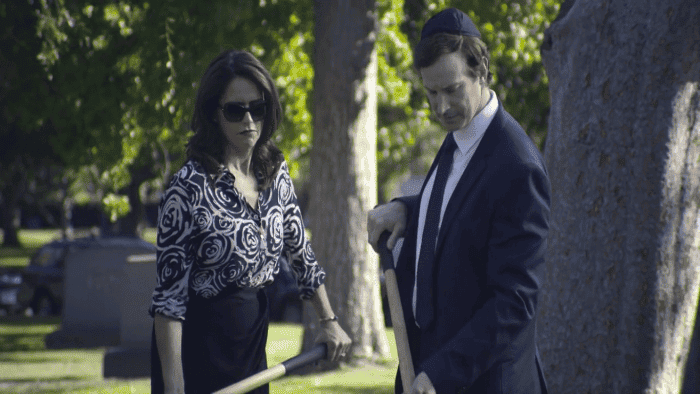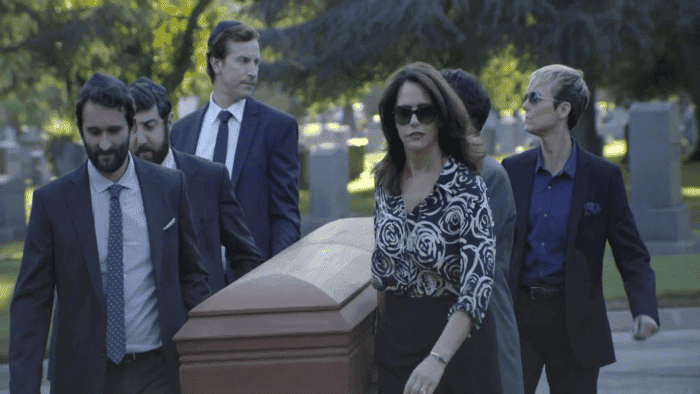 Ali está bastante enfadadita con Maura, os comento, porque recordemos que ella no celebró su Bar Mitzvah con el apoyo de su por aquel entonces padre y ahora Maura está como reconectando con su judaísmo, así que esto va a traer cola. Menos mal que tiene a Syd con ella, que obviamente como BFF no se ha querido perder un entierro tan importante e incluso le ayuda a cortarse la corbata, que es una tradición judía. Porque sí, Ali va de traje y con Syd al lado con ojillos de enamorada parecen directamente una pareja bollo. Así son las cosas y así se las hemos contado.