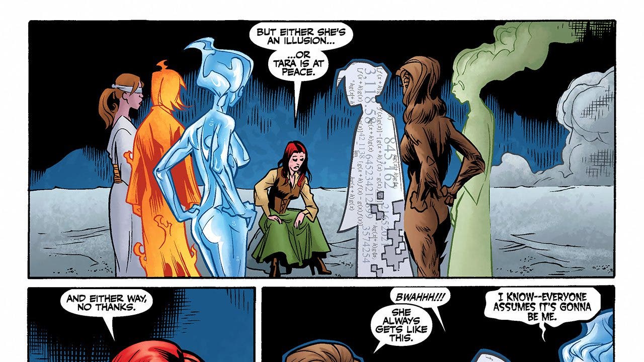 - El momento Tara – Willow No sé si Willow lo conseguirá, pero yo tengo claro que nunca podré superar la muerte de Tara, es pronunciar su nombre y tener miles de recuerdos, snifs, Taraaaaaaaaa, ejem. Pues bien en el cómic hay un momento que te rompe el corazón (sip otra vez) en el que por un segundo Willlow tiene la oportunidad de elegir a Tara como su guía y la ve (y el que lleve la ropa de Once More With The Feeling es demasiado para mi corazoncito). Pero al final Willow comprende, y admite que se ha estado mintiendo todo este tiempo sobre sus motivaciones para su supuesto viaje de autodescubrimiento. Que realmente no se buscaba a sí misma sino que todo este tiempo ha estado «esperando», «buscando» a Tara (snifs) y al verla se da cuenta de que Tara fue su luz, su camino (y la palabra clave es fue). Así que al final Willow entiende que tiene que superar lo suyo con su primera novia porque ella ya «está en paz».