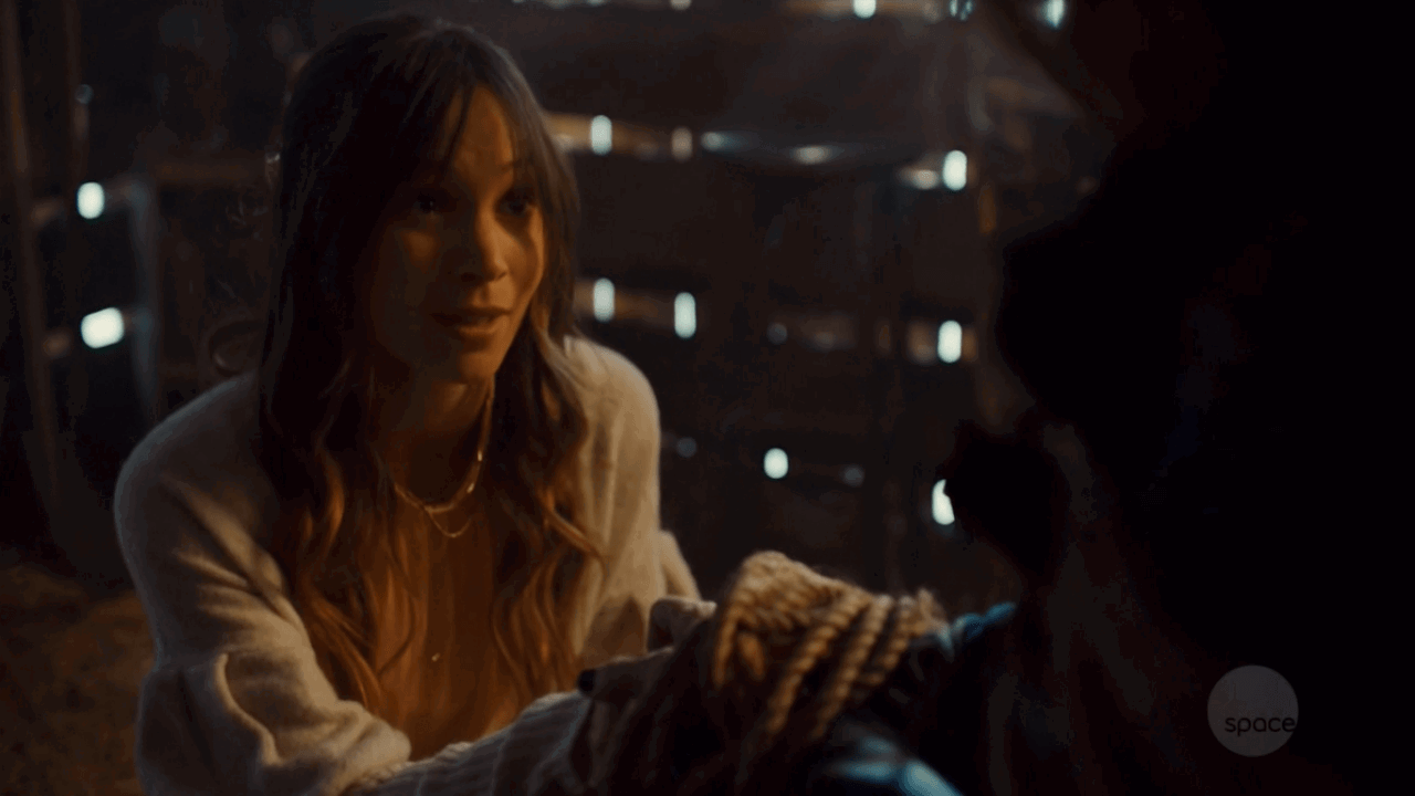 Lo malo es que Jolene ya ha seguido a Waverly hasta el invernadero con un cuchillo. Waverly está muy muy jodida porque Jolene le ha hecho creer que ella es lo que sobra en este mundo, que es malvada y la pobre ahora se siente sola y piensa que hace daño a todo el mundo. Así que no lo soporta y Jolene está al lado con el cuchillo diciéndole que es hora de acabar con todo, porque es la única forma de que pare el dolor. Por si no os habéis dado cuenta todo esto es una metáfora de la depresión bastante tocha que se ha marcado aquí Wynonna Earp muy fuertemente. Jolene es como la vocecita esa en la cabeza de Waverly que le dice que nunca es suficiente. Personalmente, esta escena me está doliendo mucho.