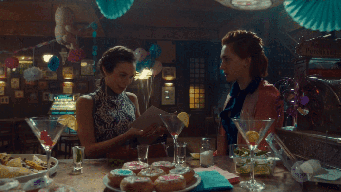 Pero antes de que nos regalen algún beso, Rosita aparece a interrumpir y decir que tiene una idea tremenda: montarle una fiesta sorpresa a Wynonna por su embarazo. Las dos se quedan un poco confundidas porque no es que Rosita y Wynonna tengan muy buena relación, pero esto es porque previamente Doc ha animado a Rosita a intentar hacer buenas migas con las hermanas Earp. Y a mí me parece una fantástica idea. Que Rosita sea novia de Doc y Doc sea ¿padre? del bebé de Wynonna no debería impedir que ambas se llevasen bien y fuesen amigas. Aquí luchas y tonterías por un mismo hombre no ¿eh? Que mi feminismo se enfada. Me gusta. Noche de chicas. Con nachos. PALANTE.